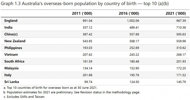 統計局公布榜單顯示,2021年,全澳排名前三的移民群體分別是英國、印度和中國。