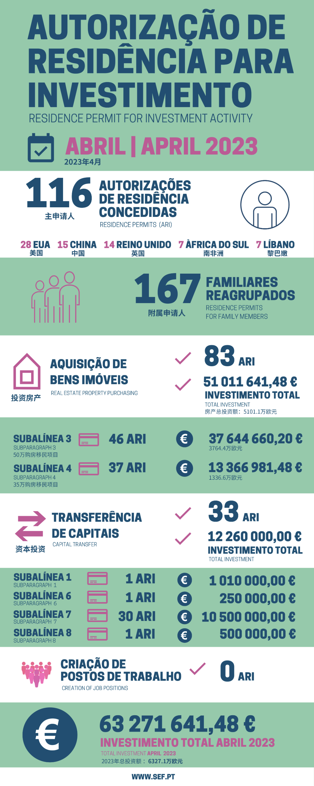 近日,葡萄牙移民局(SEF)正式發(fā)布了4月的黃金簽證最新統(tǒng)計(jì)數(shù)據(jù)。4月共有116位主申請(qǐng)人和167位附屬申請(qǐng)人獲批葡萄牙黃金簽證。獲批總?cè)藬?shù)為283人,總投資額約6327萬(wàn)歐元。
