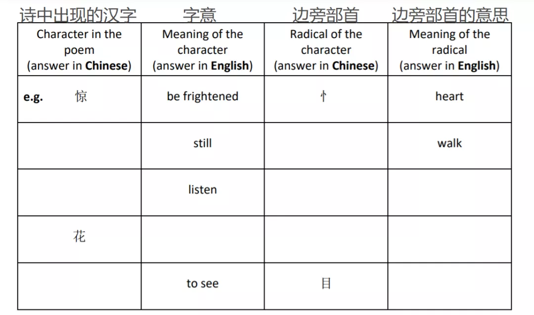 這首詩描述了一幅畫中的四種情形。描述其中的兩個,用英語回答。