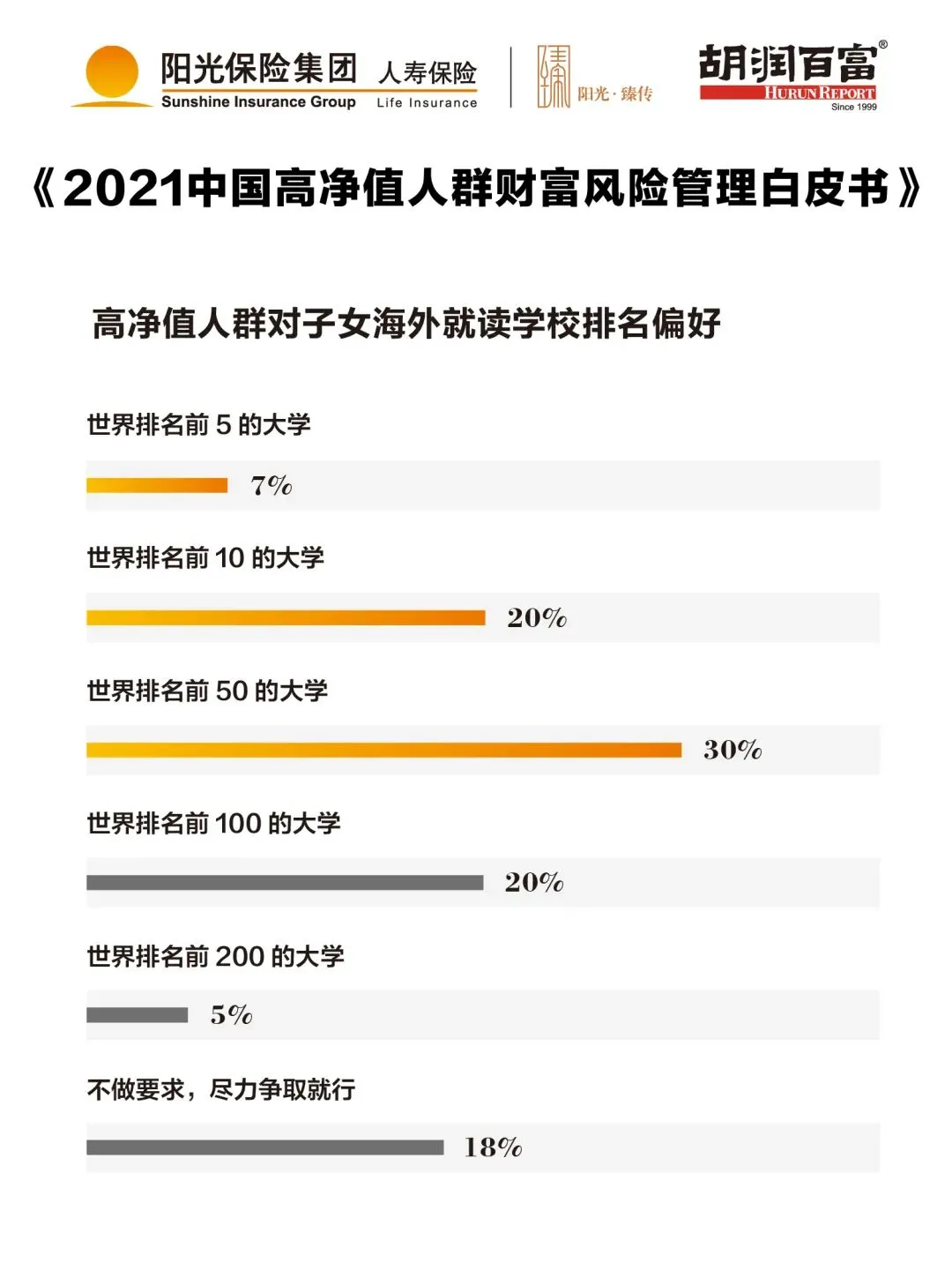 近八成受訪家庭傾向于讓子女接受海外教育,主要考慮高中(18%)和本科(26%)段作為起點。82%的家庭關注學校的世界排名,有57%的家長希望子女進入世界排名前50的大學。