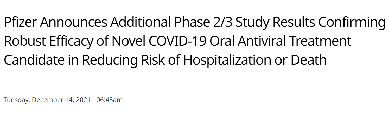 美國時(shí)間12月14日,輝瑞制藥(Pfizer) 公布了其新冠口服抗病毒藥物PAXLOVID的最終臨床分析結(jié)果,證實(shí)PAXLOVID在降低住院或死亡風(fēng)險(xiǎn)方面具有強(qiáng)大的療效,且該口服藥對(duì)快速傳播的奧密克戎變體也仍然有效。