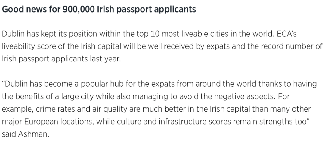 ECA國際分析師Neil Ashman表示:“對(duì)于來自世界各地的移民而言,都柏林已經(jīng)成為一個(gè)備受歡迎的中心城市,其極低的犯罪率和極高的空氣質(zhì)量遠(yuǎn)遠(yuǎn)優(yōu)于其他歐洲主要城市,同時(shí)濃厚的文藝氛圍和優(yōu)良的基礎(chǔ)設(shè)施配套也為它增分不少”。