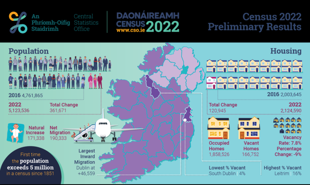 愛爾蘭中央統計局(CSO)6月中旬公布了《2022人口普查報告》初步數據。報告顯示:截至2022年4月3日的普查日,愛爾蘭總人口增長至512萬3536人,這是自1841年人口普查以來,錄得的最高數據,也是自1851年以來首次突破500萬大關。