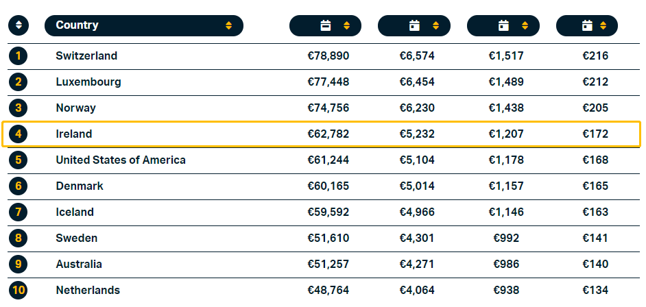 科技公司Tipalti的最新研究結果顯示,愛爾蘭是全球最適合工作和創造財富的國家之一。在全球近40個參與評比的國家和地區中,愛爾蘭“財富得分”6.89分,位列第8名。愛爾蘭平均年薪62,782歐元(約合人民幣43.2萬元),超越美國。