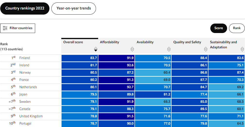 近日,《經(jīng)濟(jì)學(xué)人》發(fā)布了《2022全球食品安全指數(shù)》(Global Food Security Index,簡稱GFSI)排名,愛爾蘭以81.7的綜合分?jǐn)?shù)在全球113個評估國家中排名第二!芬蘭以83.7分由去年的全球第四上升到全球第一。中國以74.2分排名全球第25位。