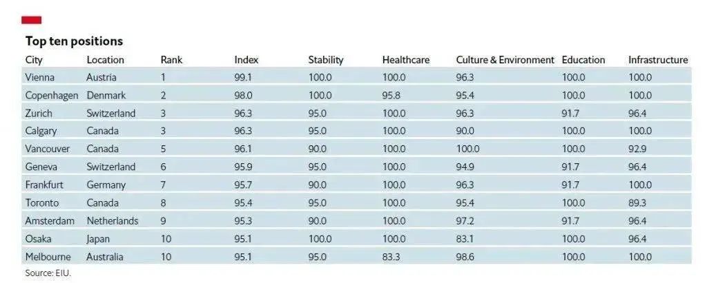 奧地利首都維也納從去年排名第12躍居2022年榜首;加拿大共3座城市位列榜單前十,分別是卡爾加里(第3)、溫哥華(第5)、多倫多(第8);日本大阪和澳大利亞墨爾本并列第10;法國巴黎、英國倫敦、美國紐約分列位列第19名、第33名和第51名;中國北京排名第71名。