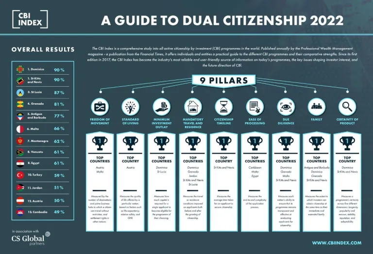 CBI 指數根據以下九大方面進行評級:行動自由、生活水平、性價比、登陸或居住要求、辦理時間表、易于處理、盡職調查、家庭團聚和項目穩定性。2022年CBI指數,將圣基茨和尼維斯列為世界上擁有經濟公民計劃的最佳國家。