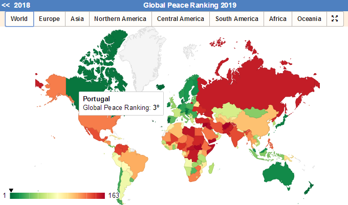 該報告以社會安全、國內國際沖突和軍事化程度為測量領域,依據23項定量或定性指標,對世界163個國家(覆蓋全。球99.7%人口)的和平狀況作出分析與排序。2019排在全球和平指數前五名的國家分別是:冰島、新西蘭、葡萄牙、奧地利和丹麥。