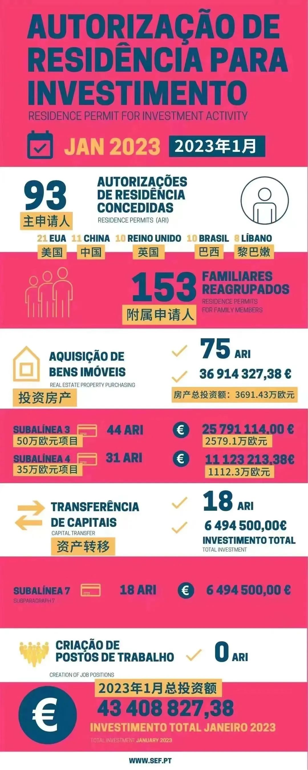 近日,葡萄牙移民局(SEF)正式發布了葡萄牙黃金簽證的1月最新統計數據。1月,共有93位主申請人,攜帶153名家屬獲得了移民審批。其中,來自美國的主申請人為21人,在申請人國家中排在首位。其次是中國11人、英國10人、巴西10人、黎巴嫩8人。