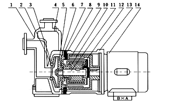 | 8.隔離層 | 9.外磁鋼總成 | 10.內(nèi)磁鋼總成 | 11.泵軸 | 12.軸套 | 13.聯(lián)接架 | 14.電機(jī) |