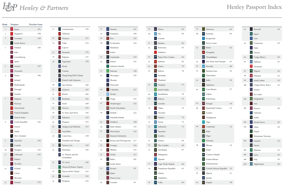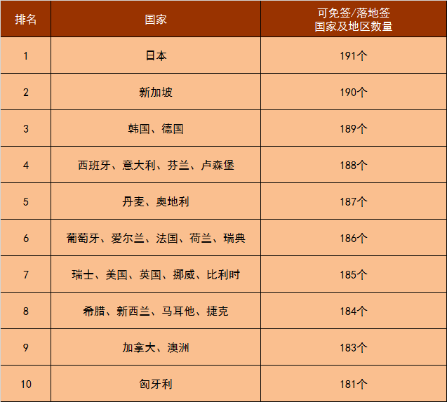 7月7日,亨氏護照指數(Henley Passport Index)公布了世界最強護照最新一季的排行榜:日本蟬聯第一(可自由通行191個國家及地區),新加坡排名第二(可自由通行190個目的地),韓國、德國排名第三(可自由通行189個目的地)。