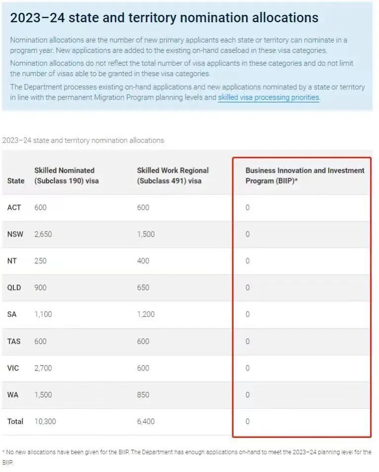 此外,各州投資移民配額全部為零!本財年澳洲投資移民通道全部關閉,無任何邀請配額。